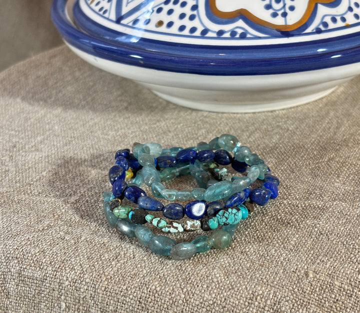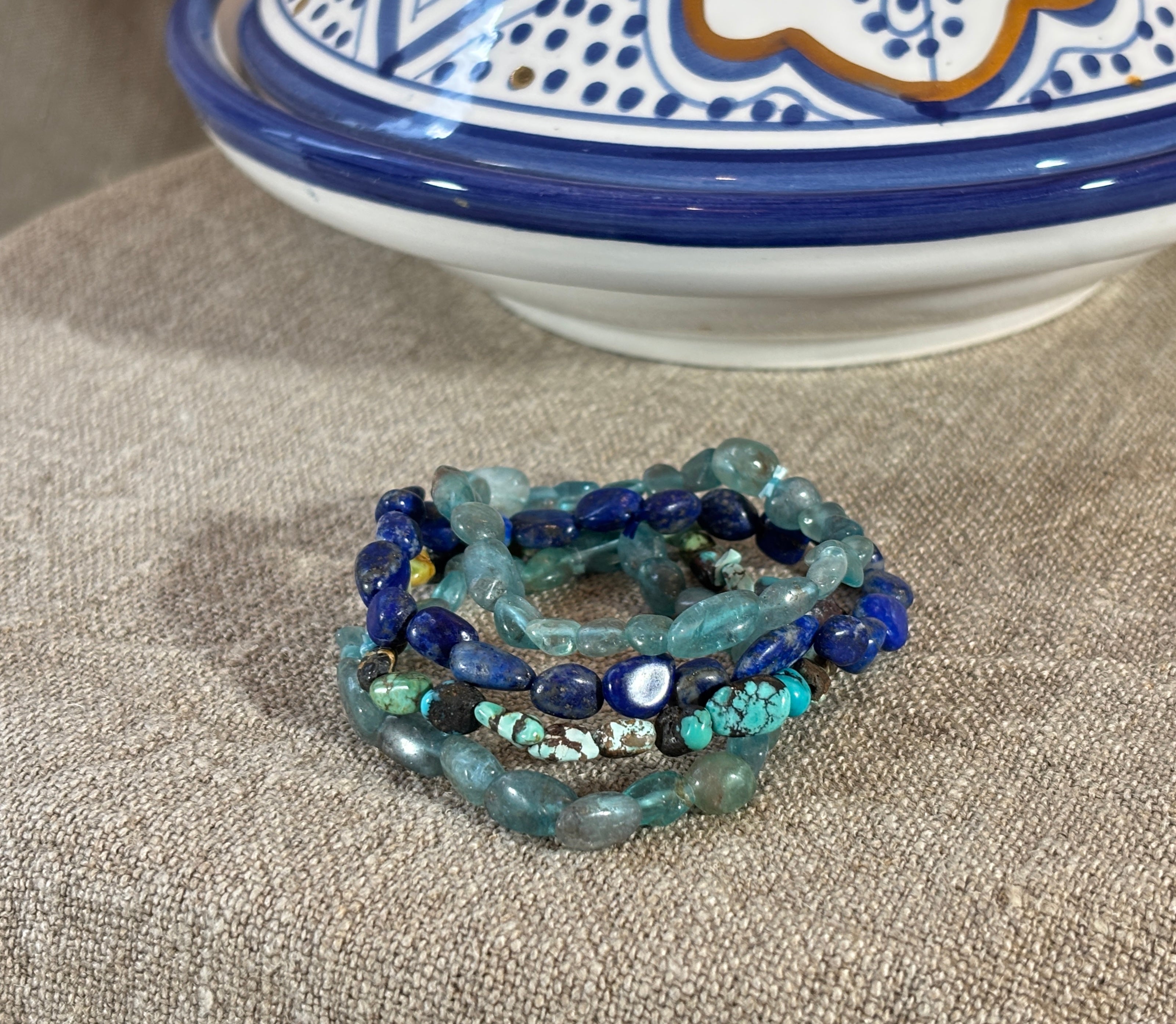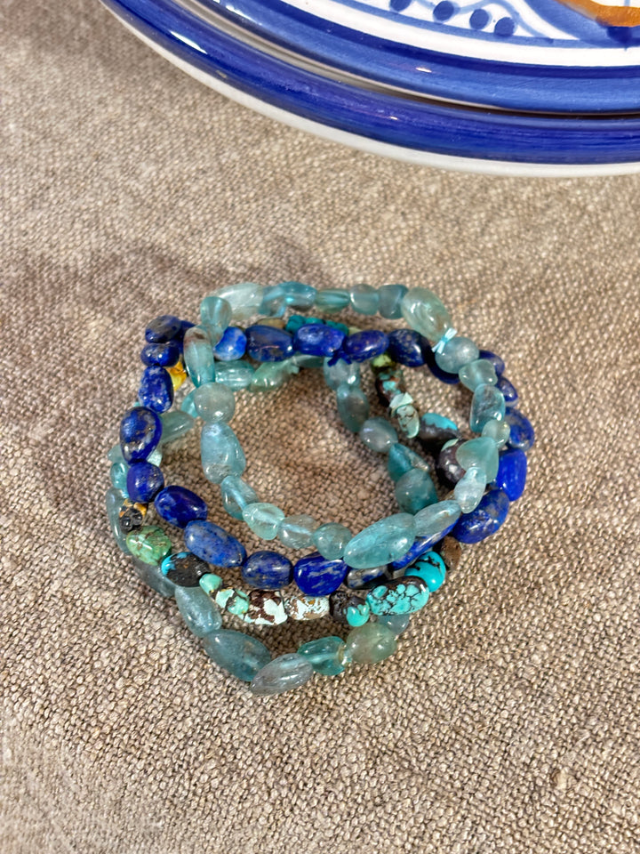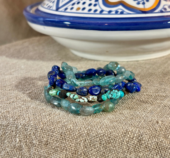 La sensation de l'exotique... avec notre collection de quatre bracelets séparés en pierres roulées dans une magnifique palette de teintes bleues et indigo des pierres précieuses Lapis Lazuli, Turquoise tibétaine et Apatite bleue ... quel look irrésistible !