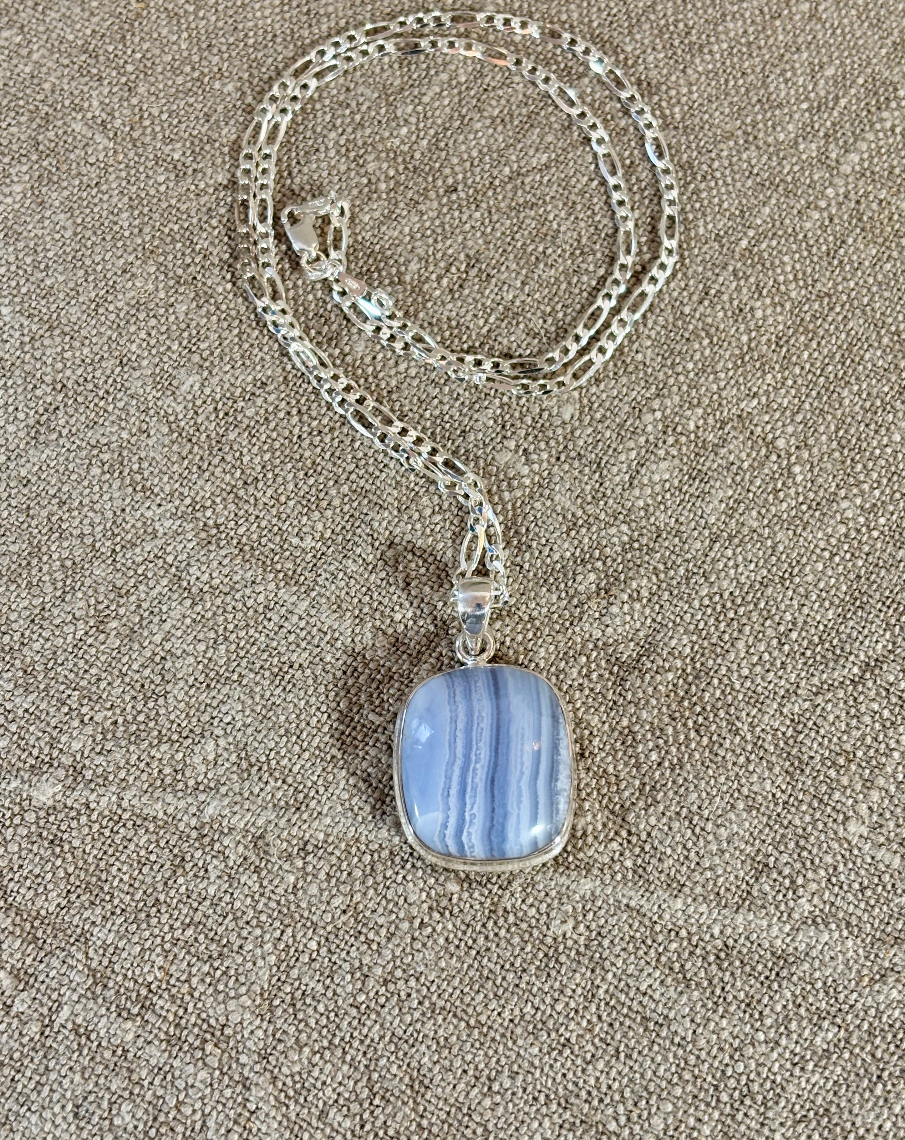 A stunning Blue Chalcedony and Silver Rectangular Pendant.. made of Sterling Silver (or 925 Silver) with a natural banded light Blue Chalcedony gemstone in a rectangular format. that has a smooth and polished silver finish, presenting a very elegant and modern design.