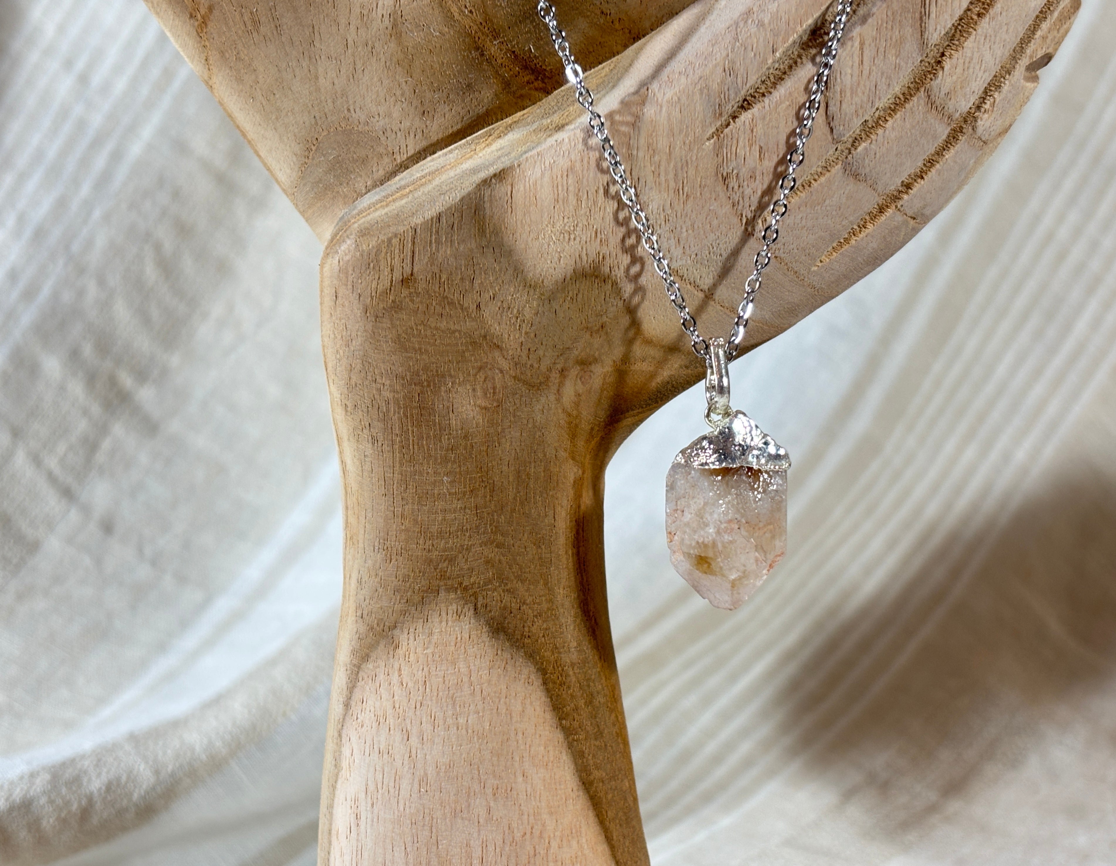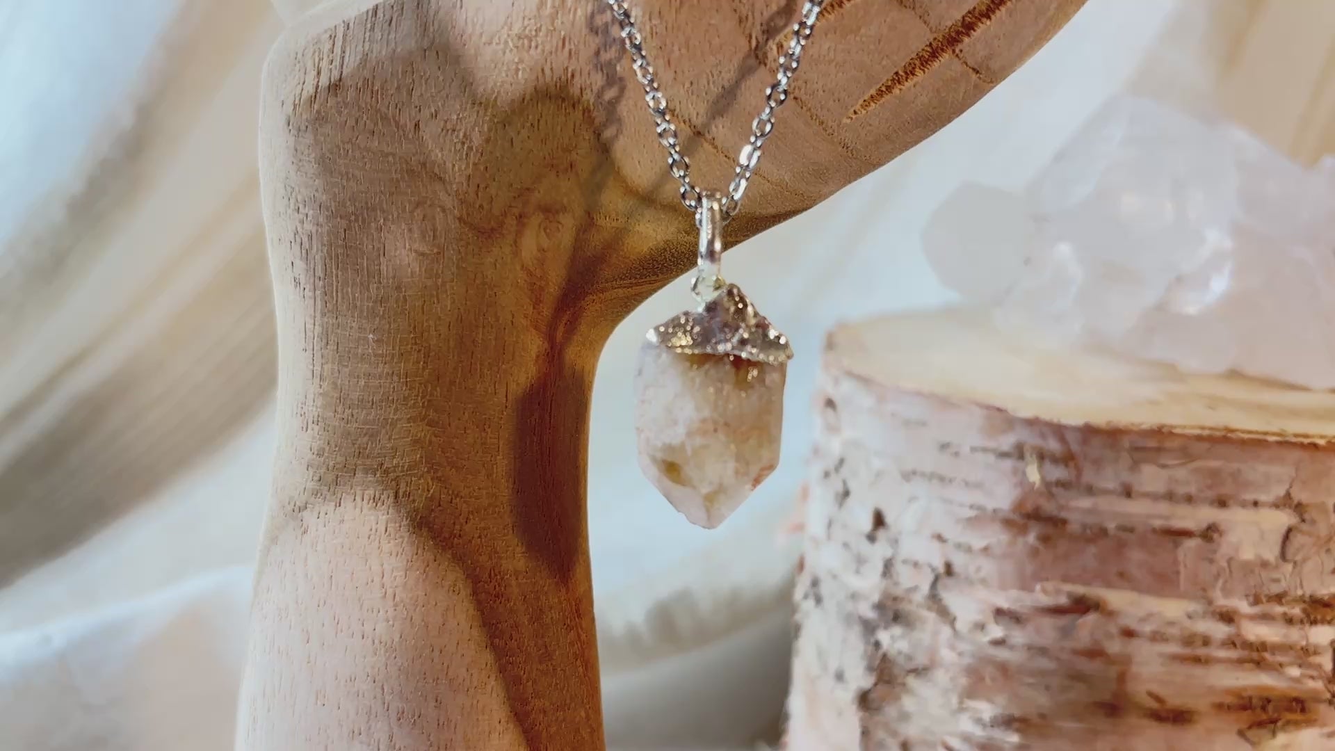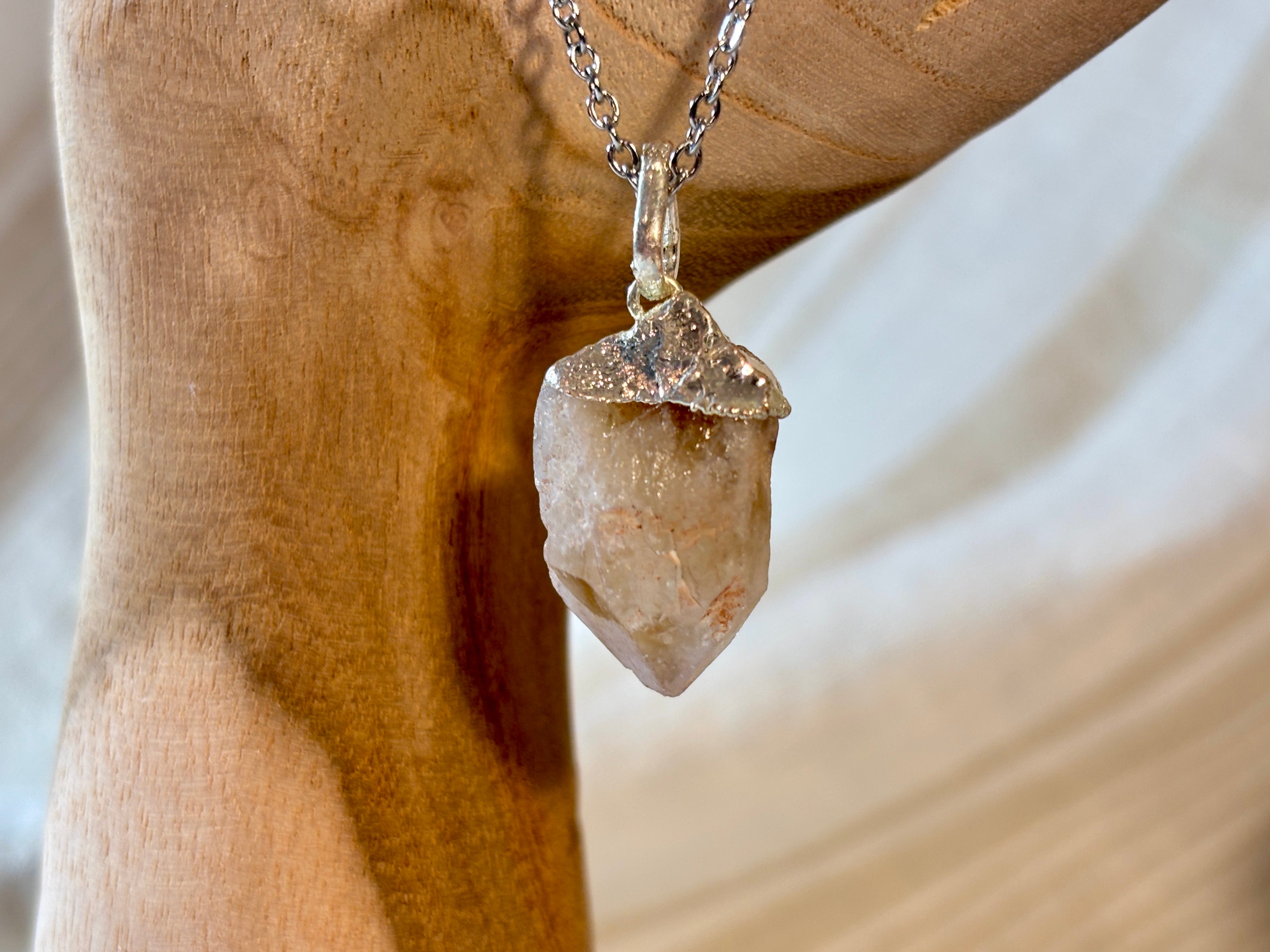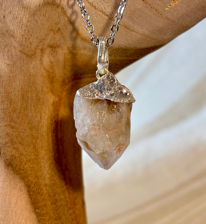 The Citrine Natural Point Pendant’s intriguing raw design emphasizes the beauty of the pale yellow crystal in its natural and unpolished state, enhanced by a delicate silver-plated finish.