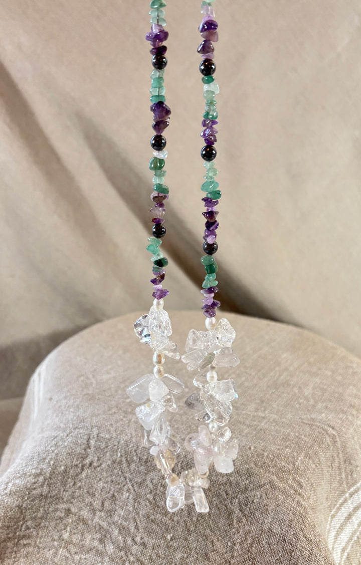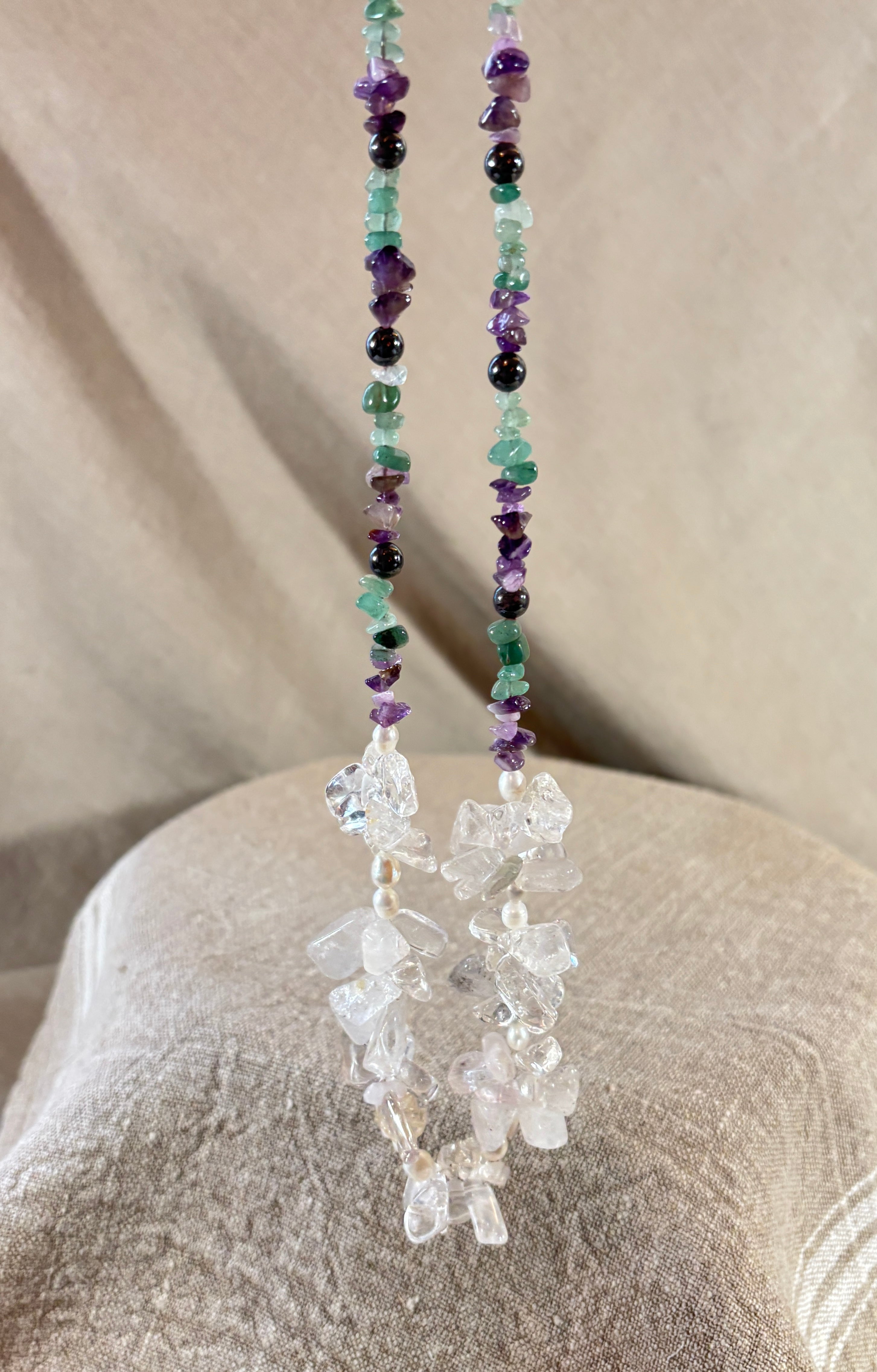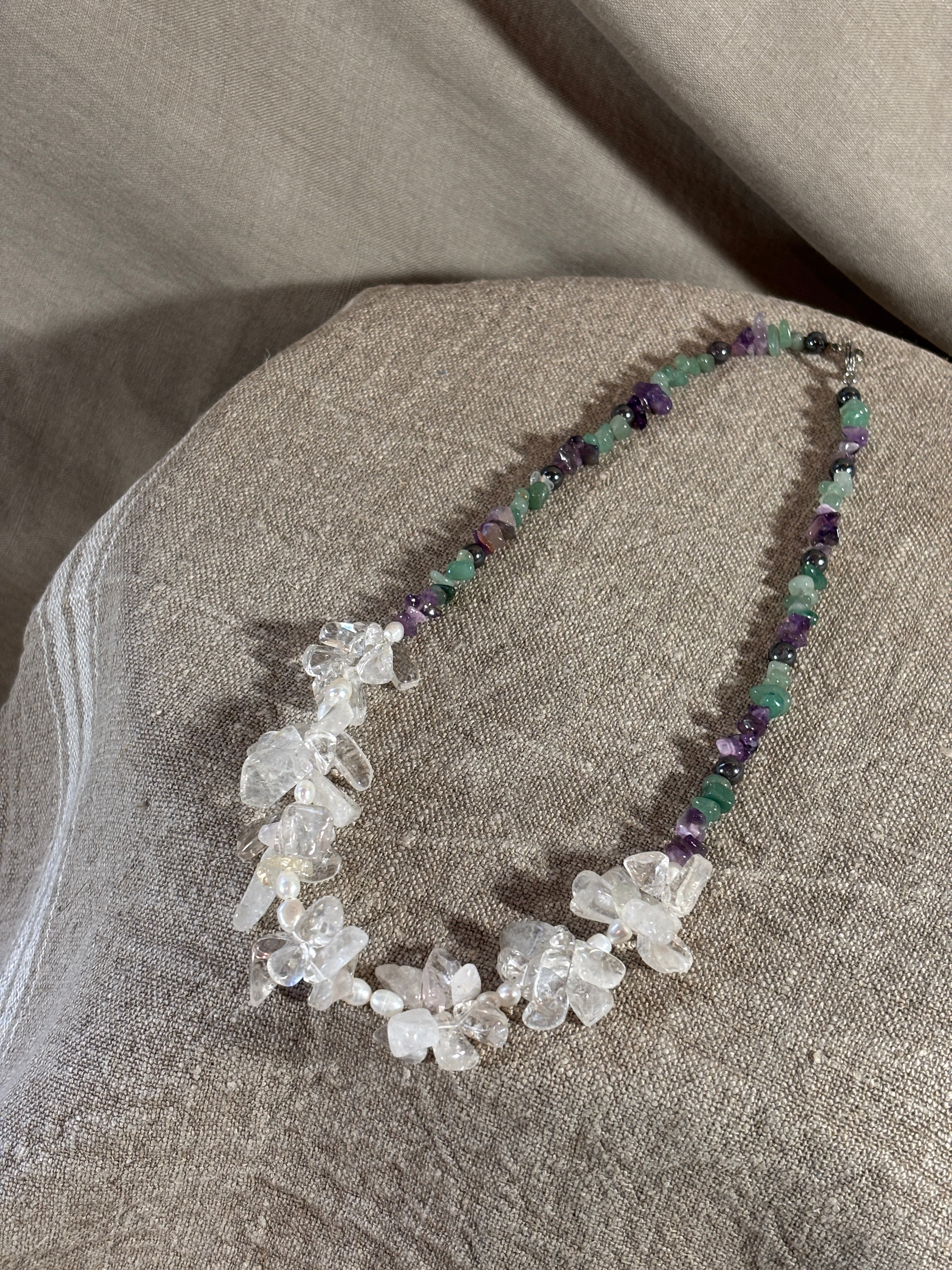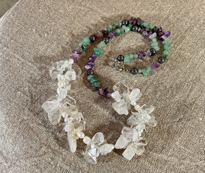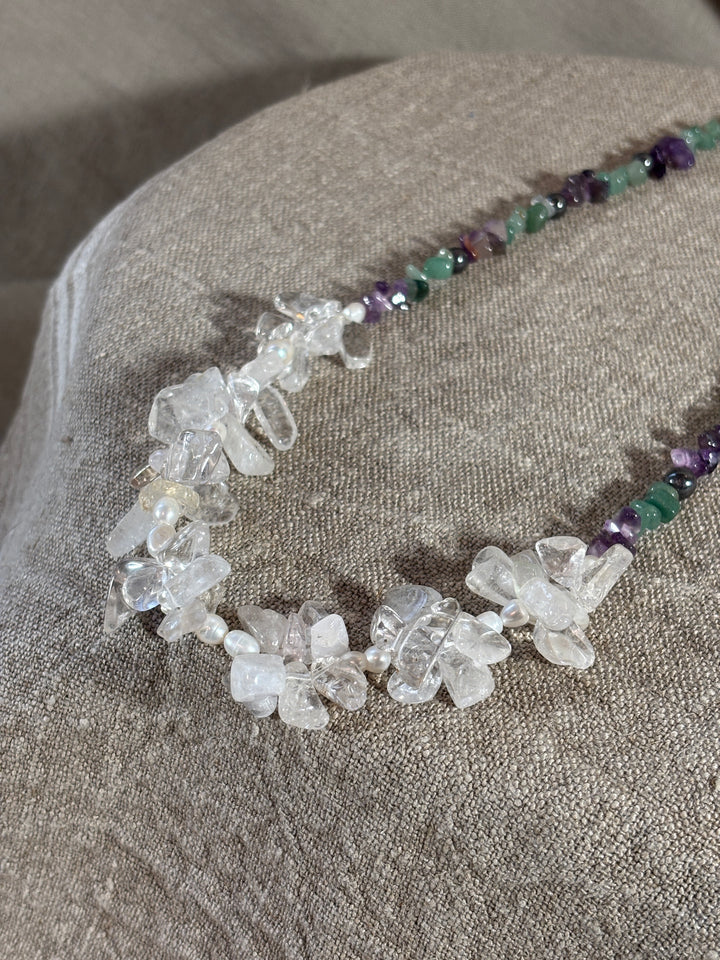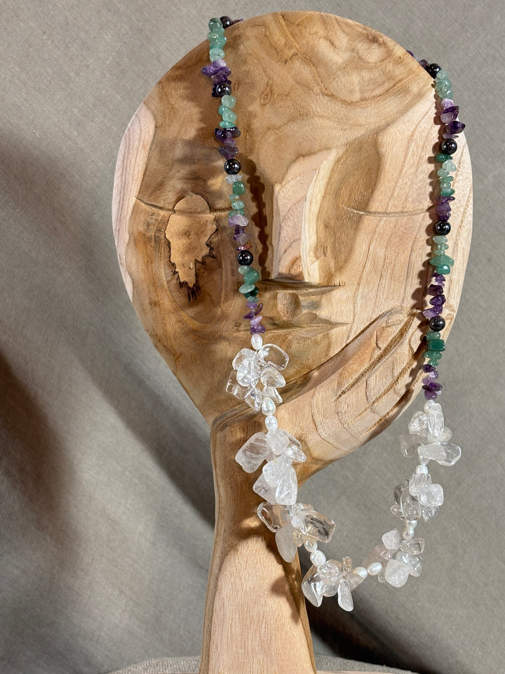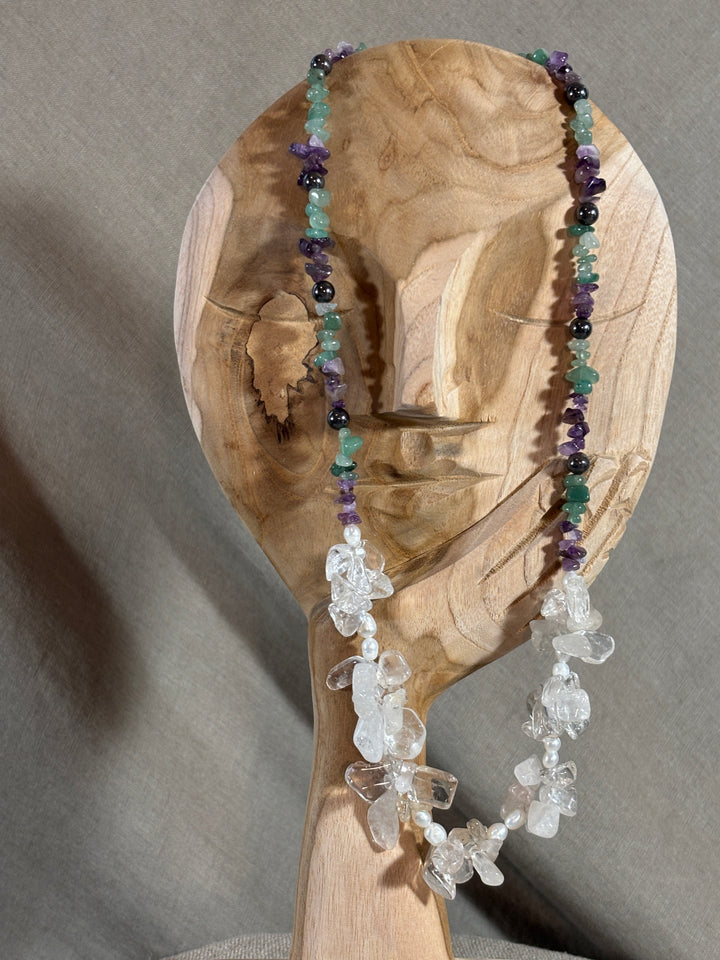 This captivating hand-made Crystal Quartz Necklace.. is a combination of beautiful clusters of polished chunky clear tumbled Quartz crystals, Amethyst and Aventurine mineral chips, with intervals of pearls and Hematite beads, for a bold yet elegant statement.