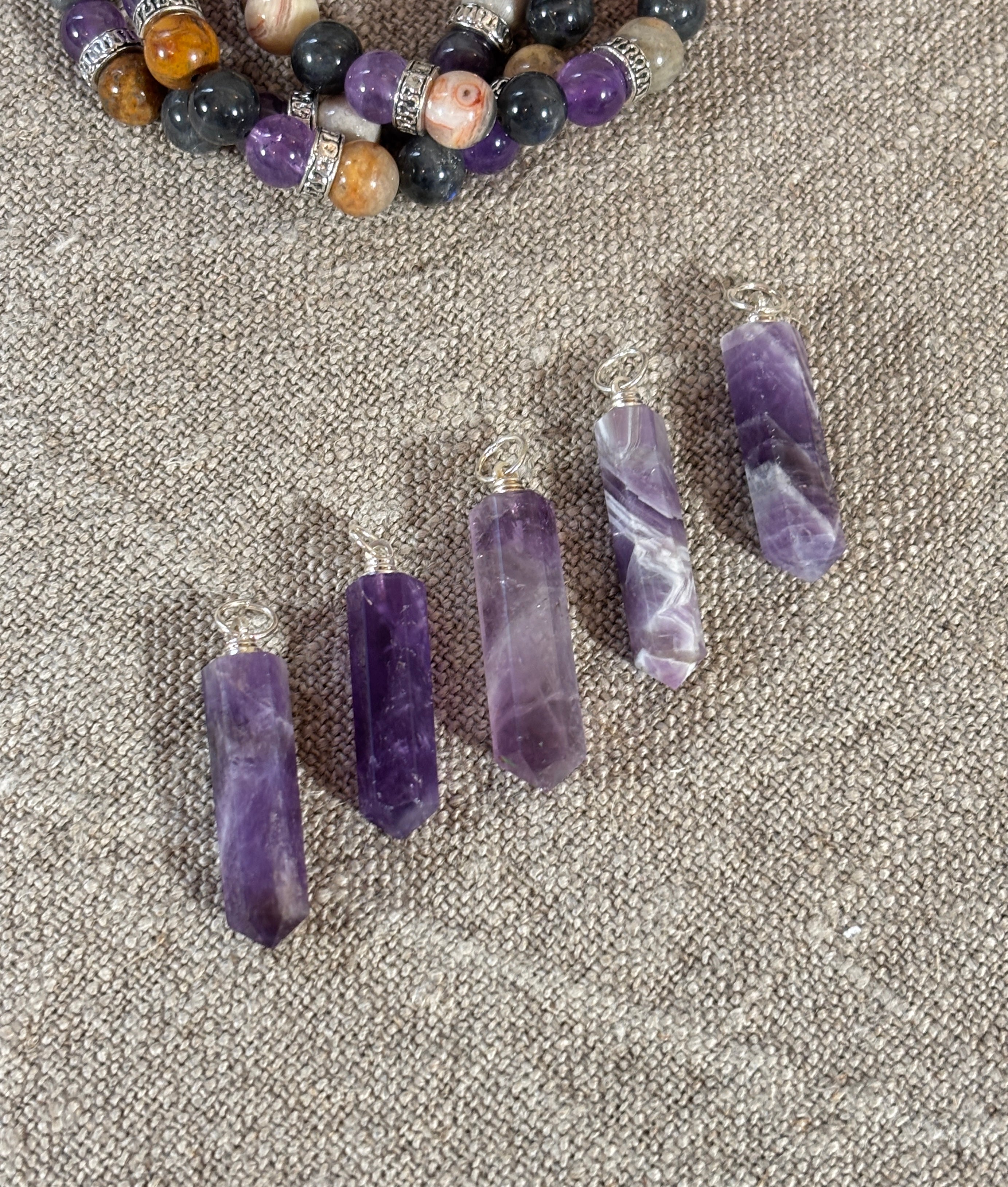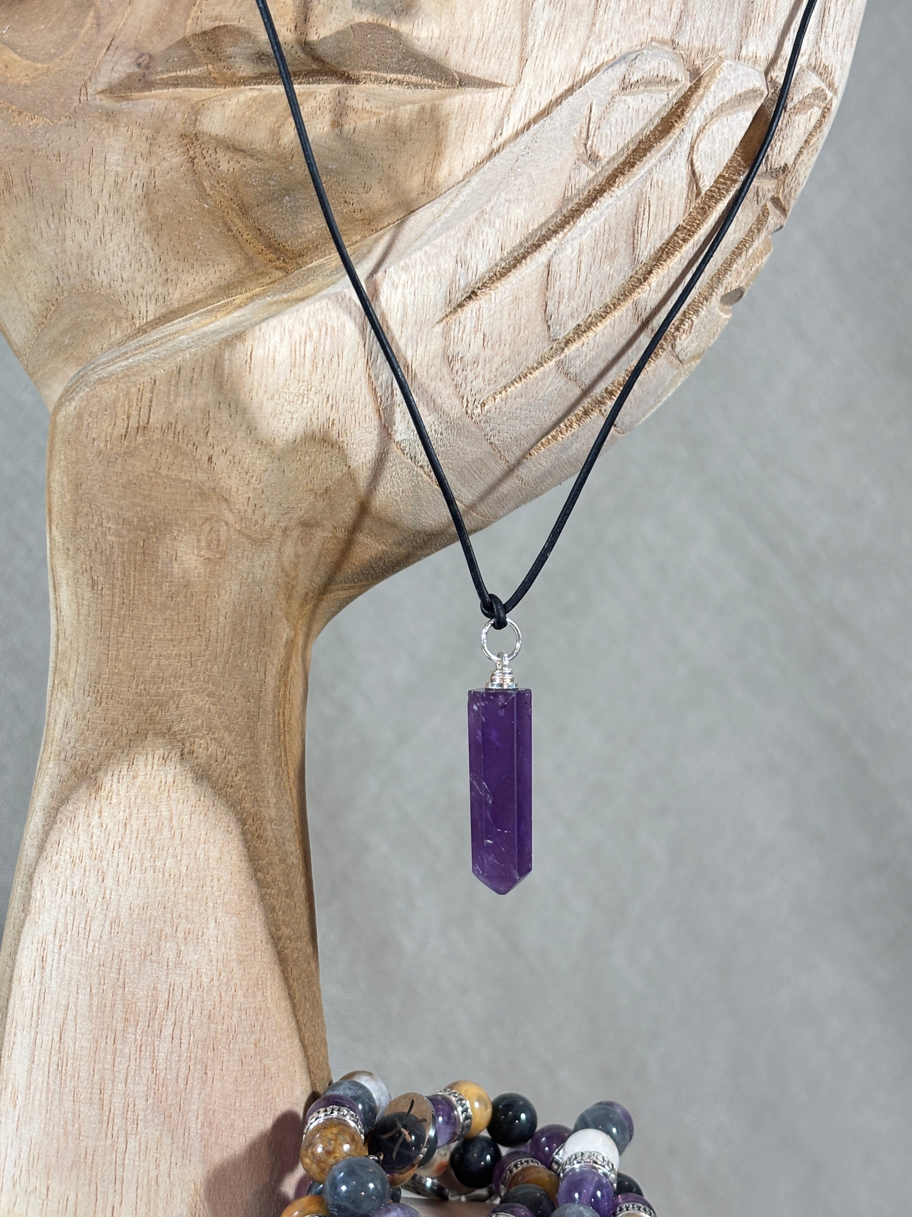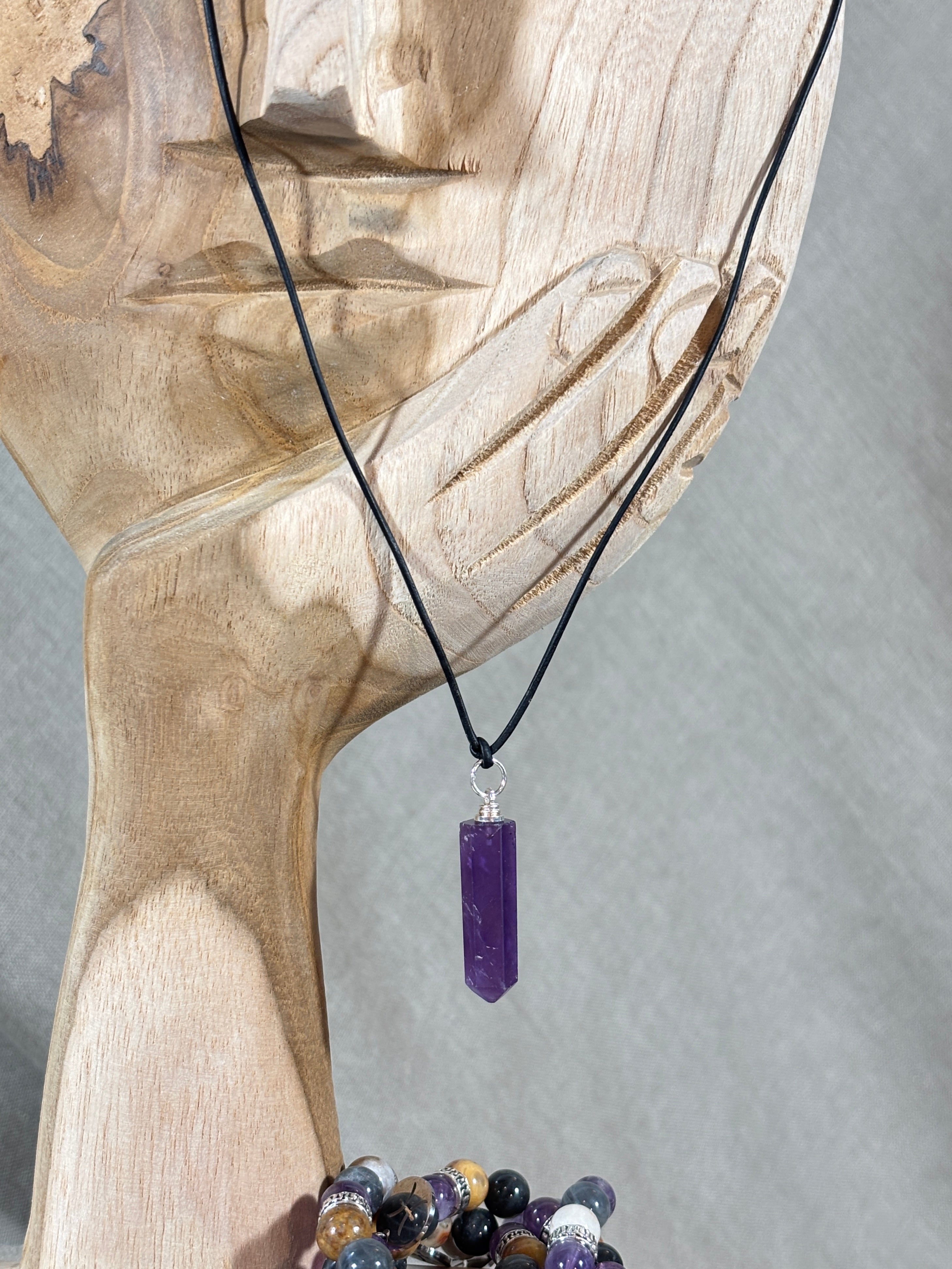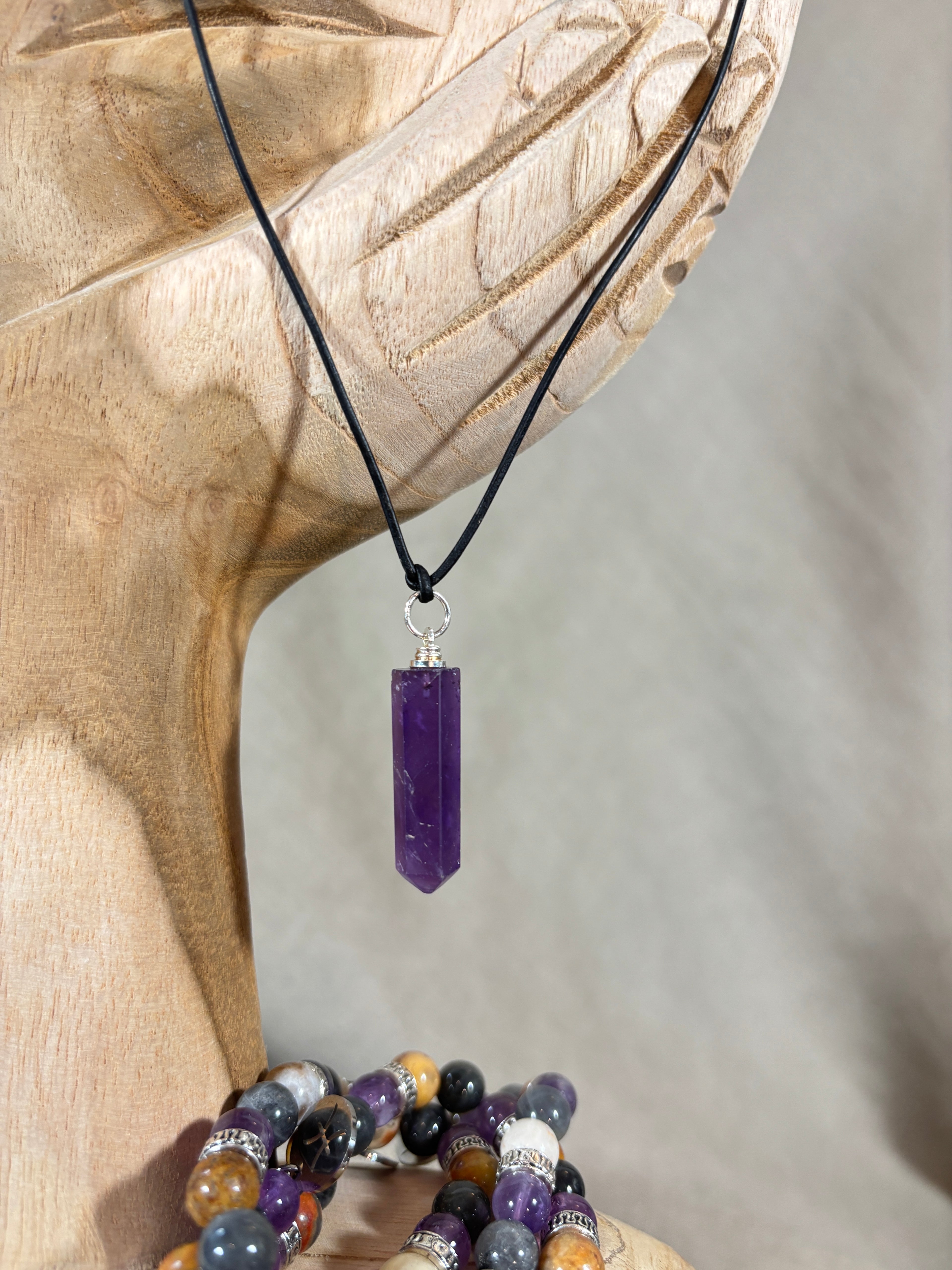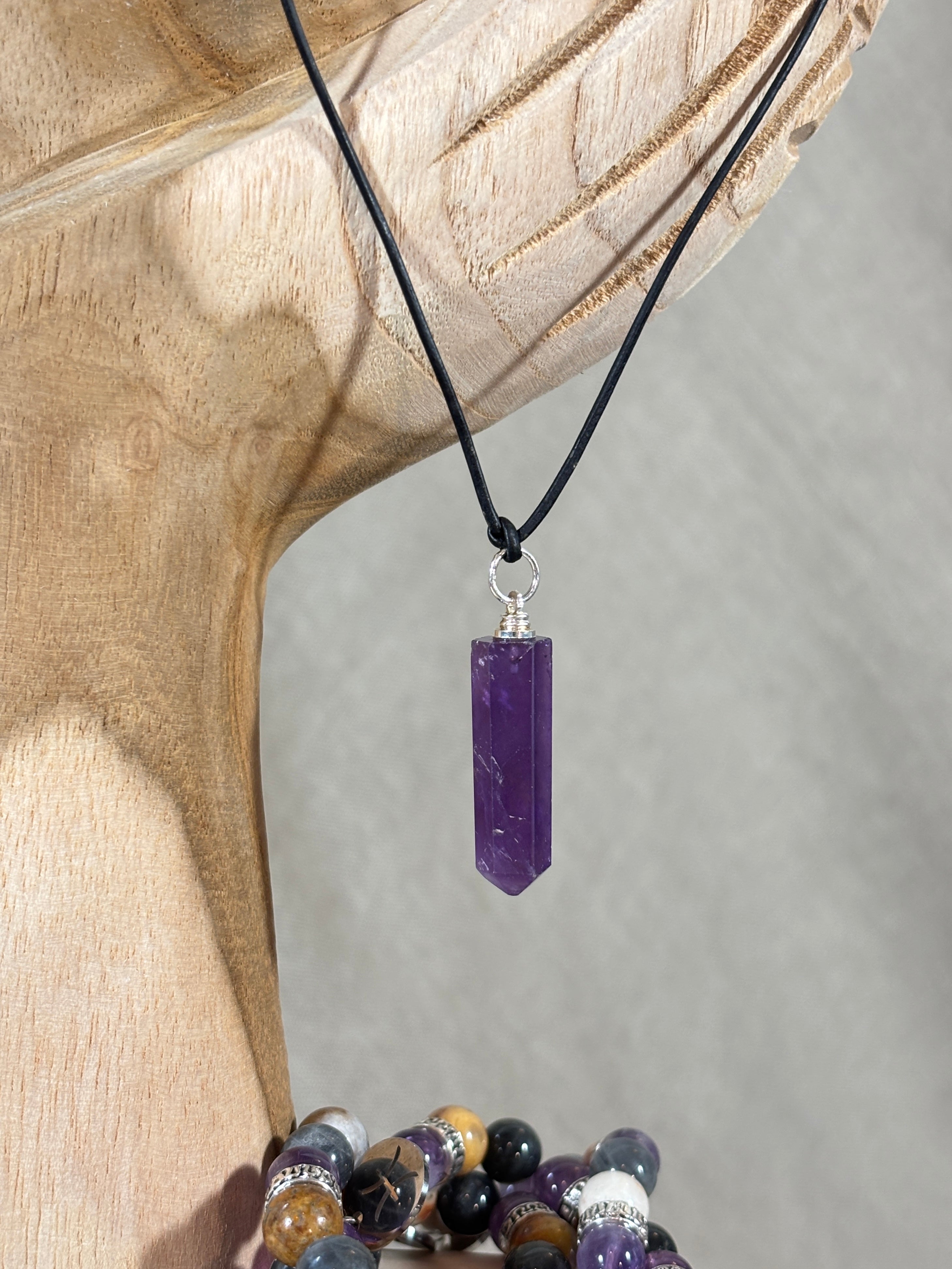 Point Pendant in Amethyst.. supplied with two separate cords: one, a round leather cord in classic Black, and the other, a waxed cotton cord in stylish Natural Brown, giving the pendant a completely different look and style with each cord association, allowing you to interchange between them according to your outfit or mood.